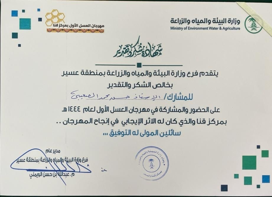 على شهادة شكر وتقدير من فرع وزارة البيئة والمياة والزراعة بمنطقة عسير نظير لمشاركته في مهرجان العسل الاول بمركز قنا التابع لمحافظة محايل عسير
