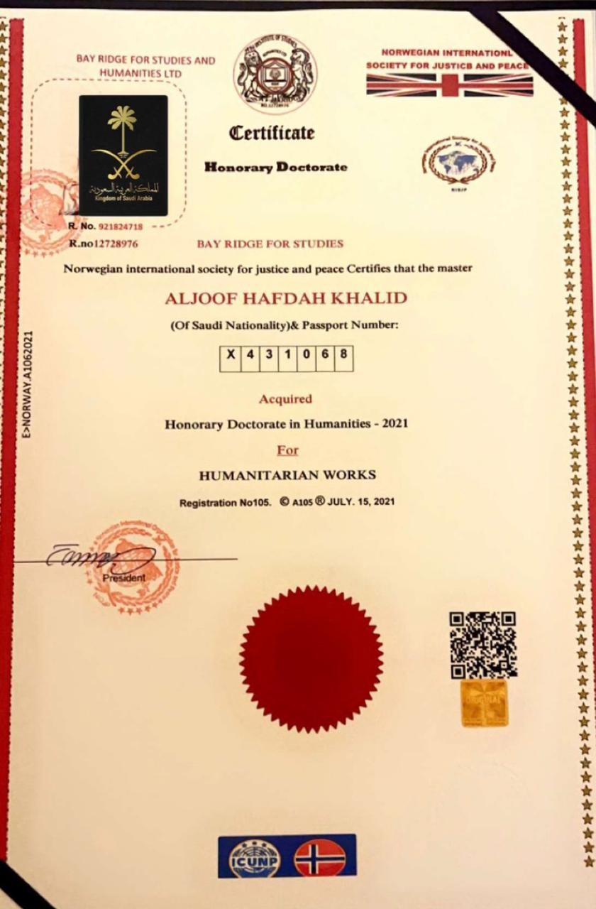 منحت الجمعية النرويجية للعدالة والسلام في ملتقاها الرابع لسفراء الإنسانية، الذي أقيم في قاعة فندق شتاينبرجر بالقاهرة في الخامس عشر من شهر يوليو، شهادة الدكتوراه الفخرية للأستاذة "حافظه بنت خالد الجوف"، وذلك بحضور نخبة من الوزراء والسادة السفراء والصحفيين والشخصيات العامة من كل أنحاء الوطن العربي.