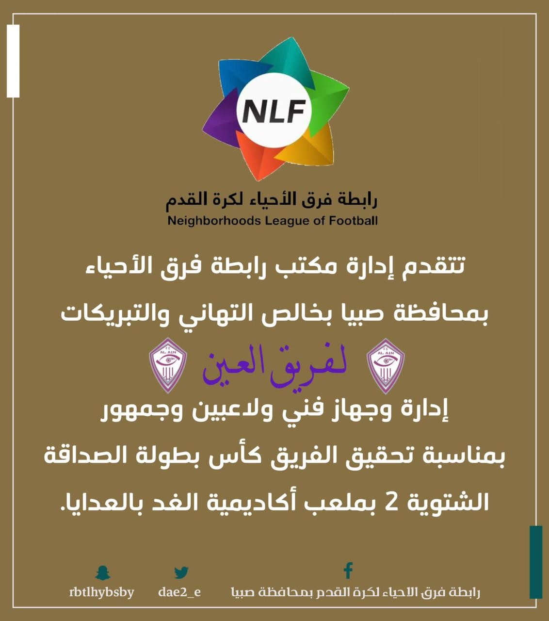 - أبو خلاد الأستاذ حسين عثاثي في ختام التتويج وعد المنظمين بتكفل لجنة التنمية بمحافظة صبيا بكأس خاص للبطولة الرمضانية القادمة مؤكدًا دعمه ودعم اللجنة للرياضيين والأنشطة الرياضية في مكتب فرق أحياء صبيا.