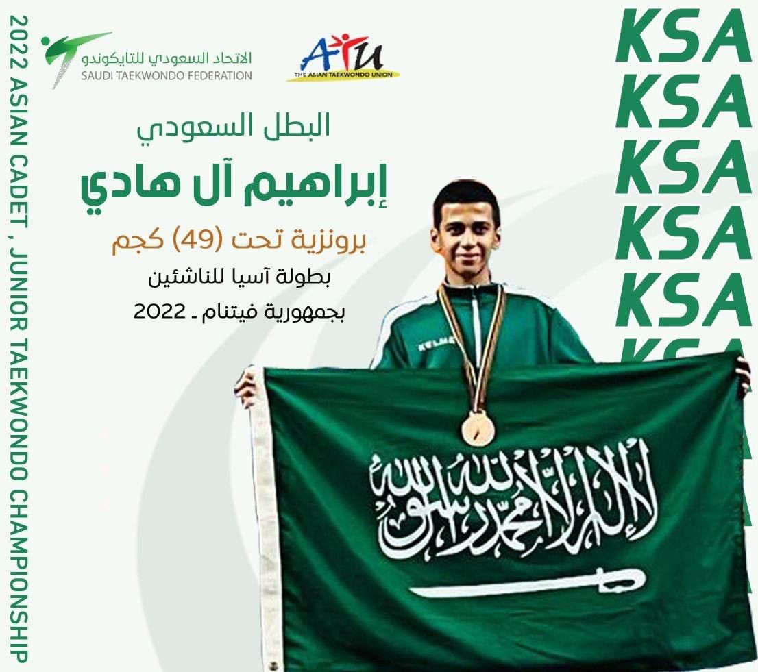 حقق لاعب المنتخب السعودي ونادي وج في لعبة #التايكوندو "إبراهيم آل هادي " الميدالية البرونزية تحت ( 49 ) كجم في بطولة آسيا للناشئين بجمهورية فيتنام - 2022 ، ويعد إبراهيم احد النجوم البارزة في صفوف نادي وج ومن الأسماء الواعدة التي يؤمل عليها النادي في خدمة اللعبة وتمثيل المنتخبات الوطنية.