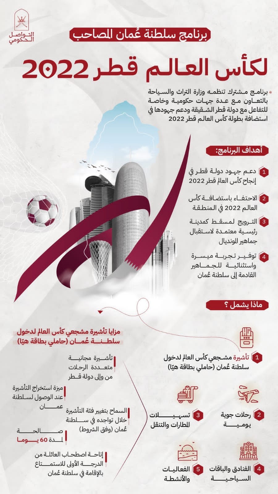 عُقد صباح اليوم مؤتمرًا صحفياً للإعلان عن برنامج سلطنة عُمان المصاحب لكأس العالم قطر 2022، وذلك في مركز عُمان للمؤتمرات والمعارض، حيث تم الكشف عن استعدادات سلطنة عُمان من خلال برنامجا مشتركا للتفاعل مع دولة قطر الشقيقة ودعم جهودها في استضافة بطولة كأس العالم قطر ٢٠٢٢، ويُدار البرنامج من قبل فريق عمل مشترك برئاسة وزارة التراث والسياحة ويضم عدة جهات حكومية وخاصة هي وزارة الثقافة والرياضة والشباب وشرطة عمان السلطانية وجهاز الاستثمار العماني ممثلا في الشركة العمانية للتنمية السياحية (مجموعة عمران) وشركة الطيران العماني وشركة مطارات عمان إلى جانب عدد من المؤسسات الداعمة للبرنامج.