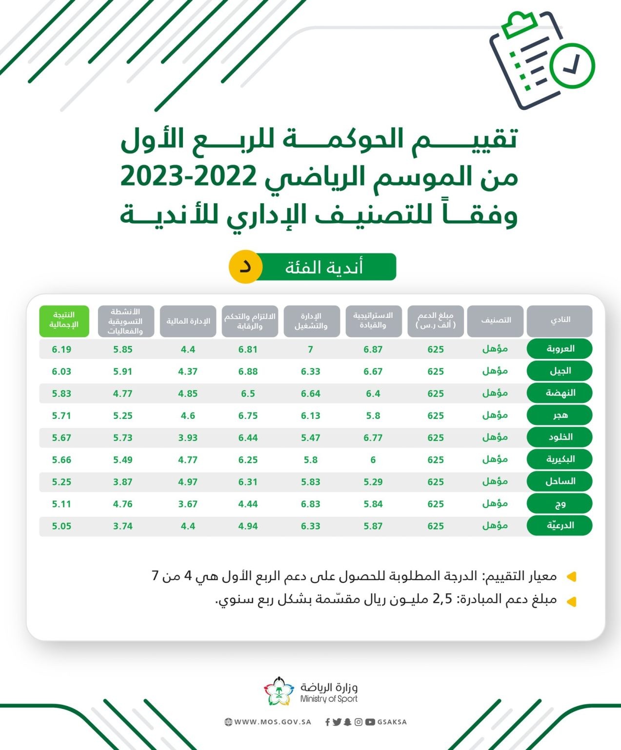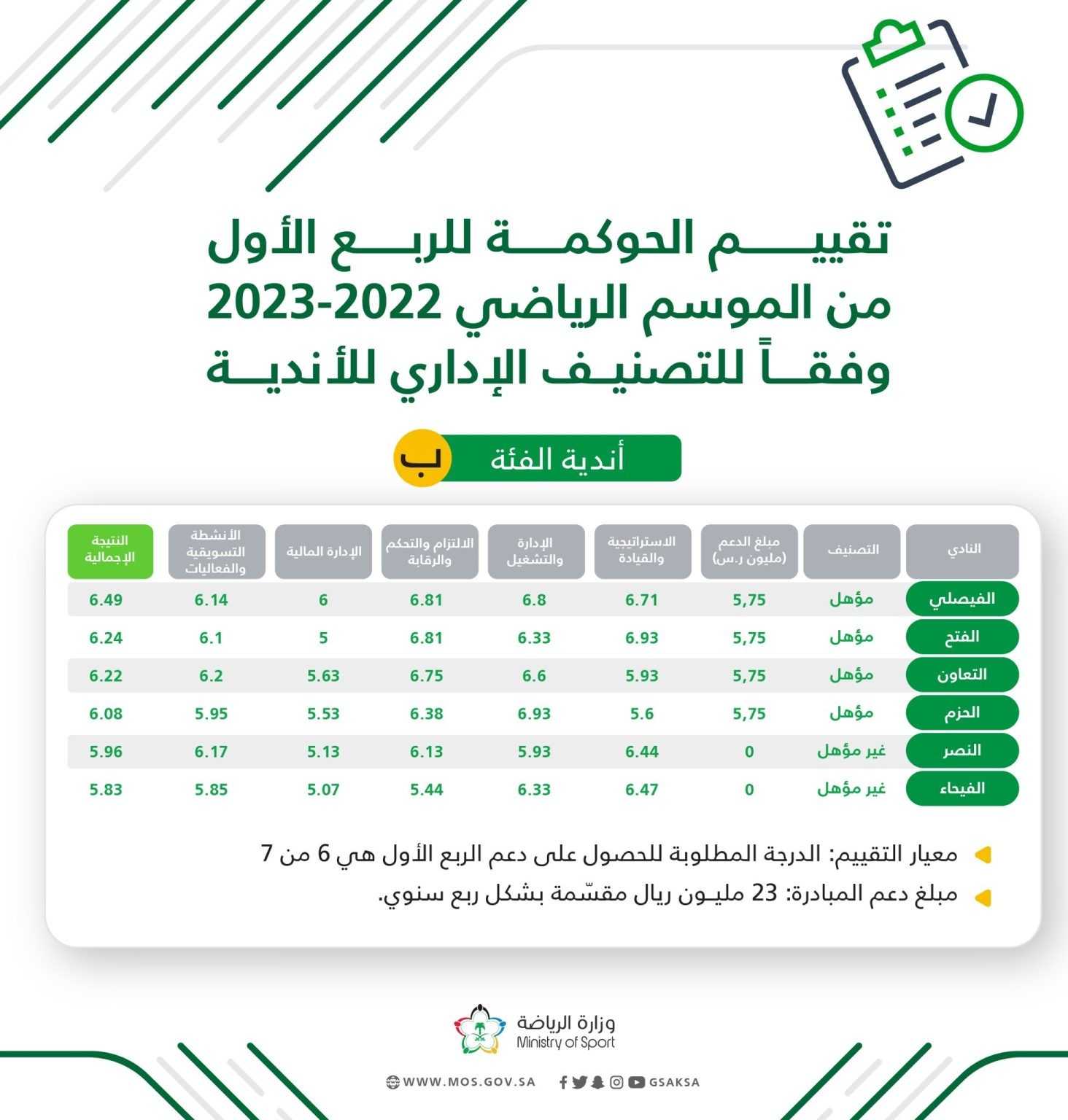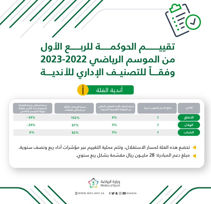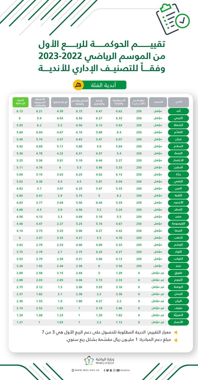 اعلنت وزارة الرياضة اليوم عن نتائج استراتيجية دعم الأندية وفقا لتقييم مبادرة الحوكمة للربع الأول من الموسم الرياضي 2022-2023 .