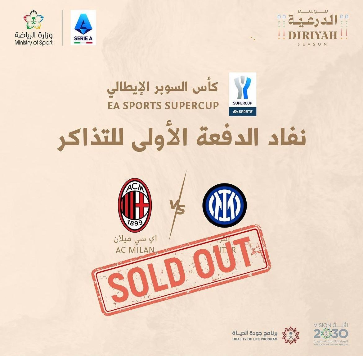أعلنت الجهة المنظمة لفعاليات النسخة الثانية لموسم الدرعية اليوم السبت عن نفاذ الدفعة الأولى من تذاكر كأس (EA SPORTS)السوبر الإيطالي، الذي سيجمع فريقي أي سي ميلان وإنتر ميلان على استاد الملك فهد بالغاصمة الرياض المقررة في 18 من يناير المقبل . .
