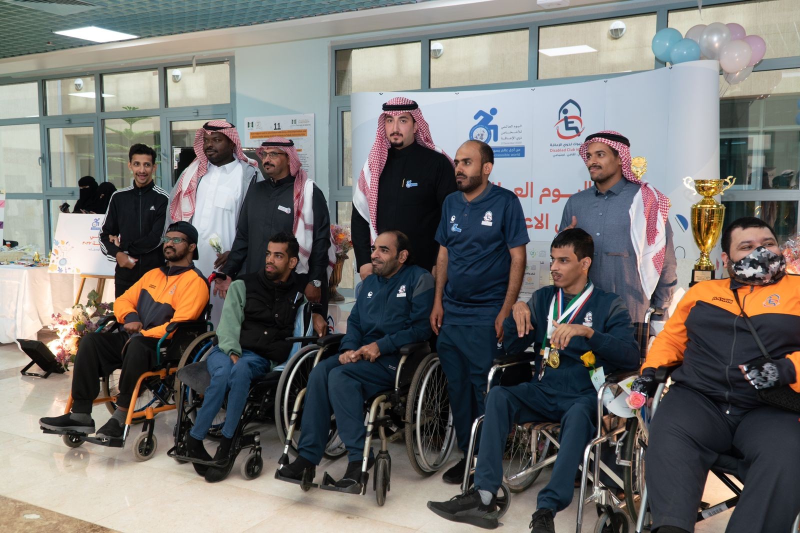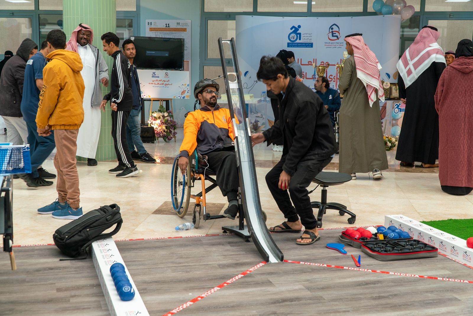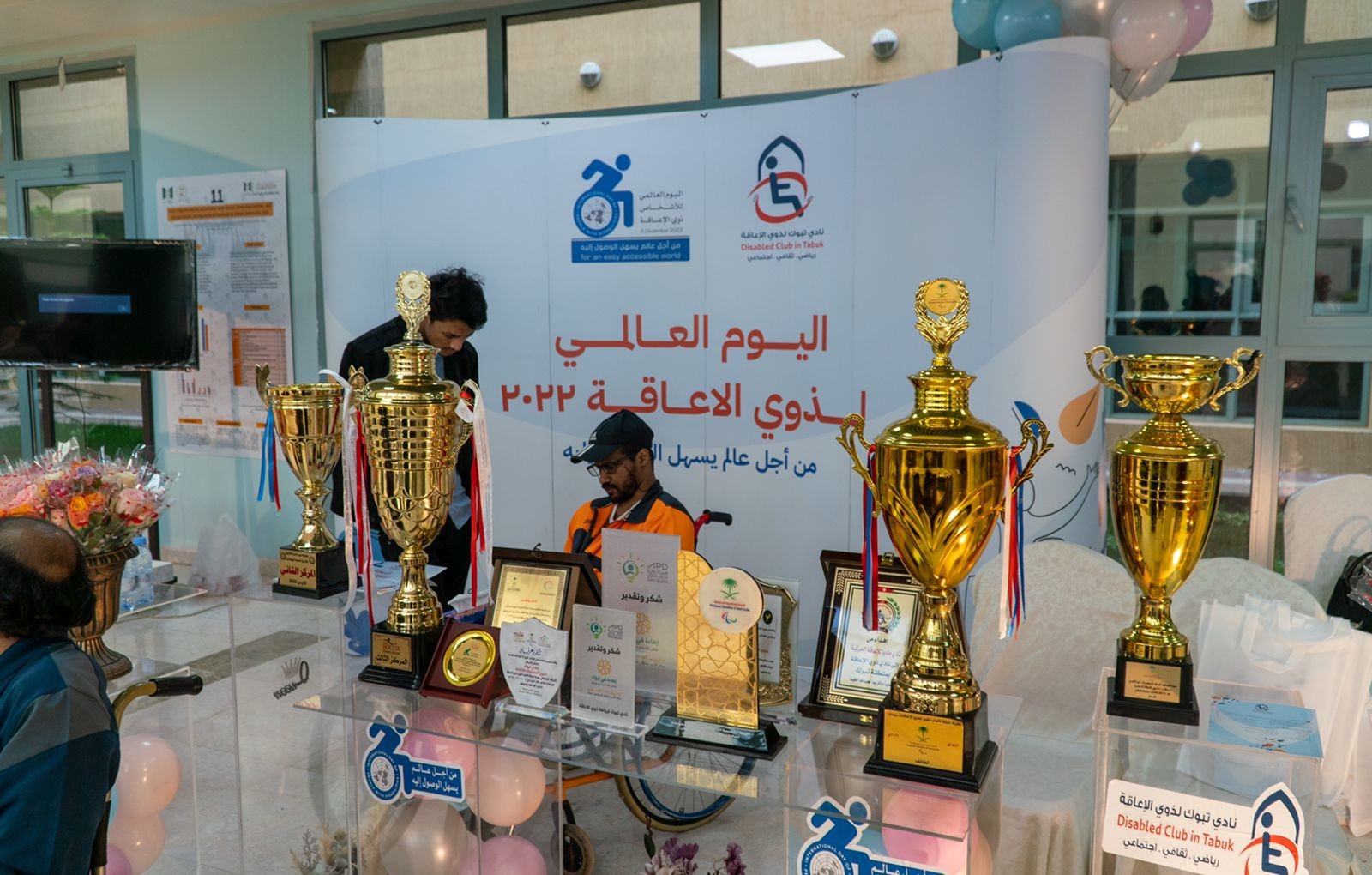 احتفل نادي تبوك لذوي الإعاقة صباح اليوم الأحد بمناسبة اليوم العالمي للأشخاص ذوي الإعاقة تحت شعار من أجل عالم يسهل الوصول إليه بحضور المدير التنفيذي للنادي الاستاذ طيار السحيم نيابة عن رئيس مجلس الإدارة الاستاذ احمد عطية الحارثي وحضور مدرب المنتخب السعودي لذوي الإعاقة الكابتن نسيمة أمير وبمشاركة عدد من ذوي الإعاقة وذلك في مقر بهو جامعة تبوك. واشتملت الفعاليات التي أقيمت بهذه المناسبة على العديد من الفقرات التثقيفية بدور النادي وما يقدمه للأشخاص ذوي الإعاقة من برامج وأنشطة رياضية تمثل نموذجاً في العزم وتحدي الإعاقة واستعراض عدد من منجزات النادي الرياضية داخليا وخارجيا