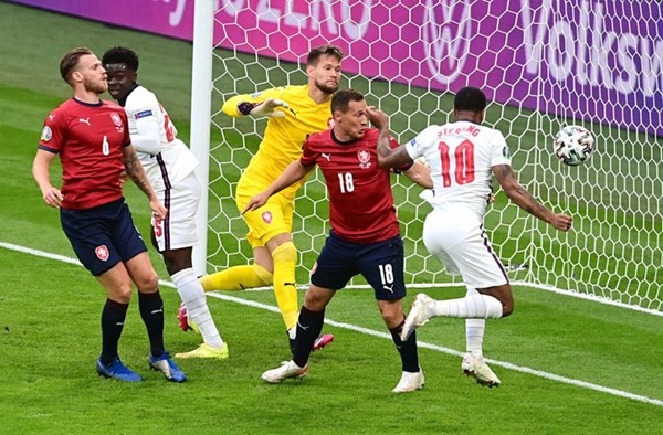 بدأ المنتخب الانجليزي المباراة مبكرا بضغط وهجوم مكثف وحصر لاعبي التشيك في ملعبه في الدقائق العشر الأولى التي لم يصل فيها لاعبو التشيك لمرمى انجلترا، وشهدت الدقيقة الثانية أول فرصة حقيقية للاعب رحيم ستيرلينغ الذي أرسل الكرة من فوق الحارس توماس فاكليك ليتصدى لها القائم، الا انه وفي هجمة مرتدة سريعة بعد ان وصلت الكرة لجاك جريليش على الجانب الأيسر داخل منطقة الجزاء فأرسلها عرضية قابلها ستيرلينغ من على القائم الثاني برأسية داخل الشباك (12).