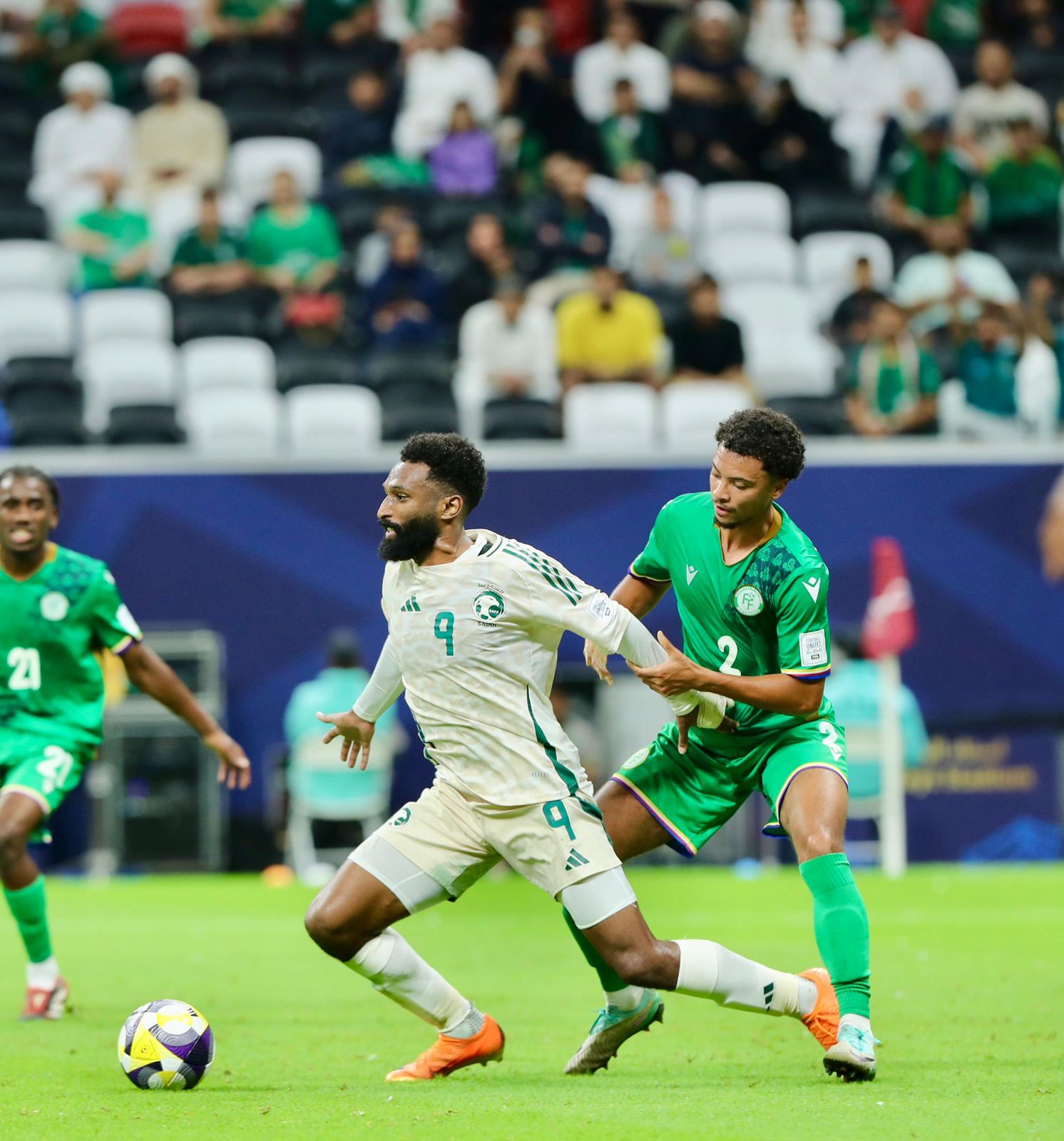 شهدت المباراة أحداثًا مثيرة منذ بدايتها حيث أشهر الحكم البطاقة الصفراء في وجه مصعب الجوير عند الدقيقة السادسة، كما طالب لاعبو السعودية بركلة جزاء في الدقيقة الأربعين لكن الحكم قرر استئناف اللعب واحتساب ركنية. افتتح محمد كنو التسجيل برأسية في الدقيقة 45+1 بعد عرضية متقنة من سالم الدوسري، ثم عاد كنو ليضيف الهدف الثاني في الدقيقة 51 مستغلًا تمريرة أرضية من الدوسري. وفي الدقيقة 63 قلص منتخب جزر القمر الفارق عبر إبراهيم يوسف، قبل أن يحسم سالم الدوسري النتيجة بالهدف الثالث في الدقيقة 76 بعد مجهود فردي مميز.