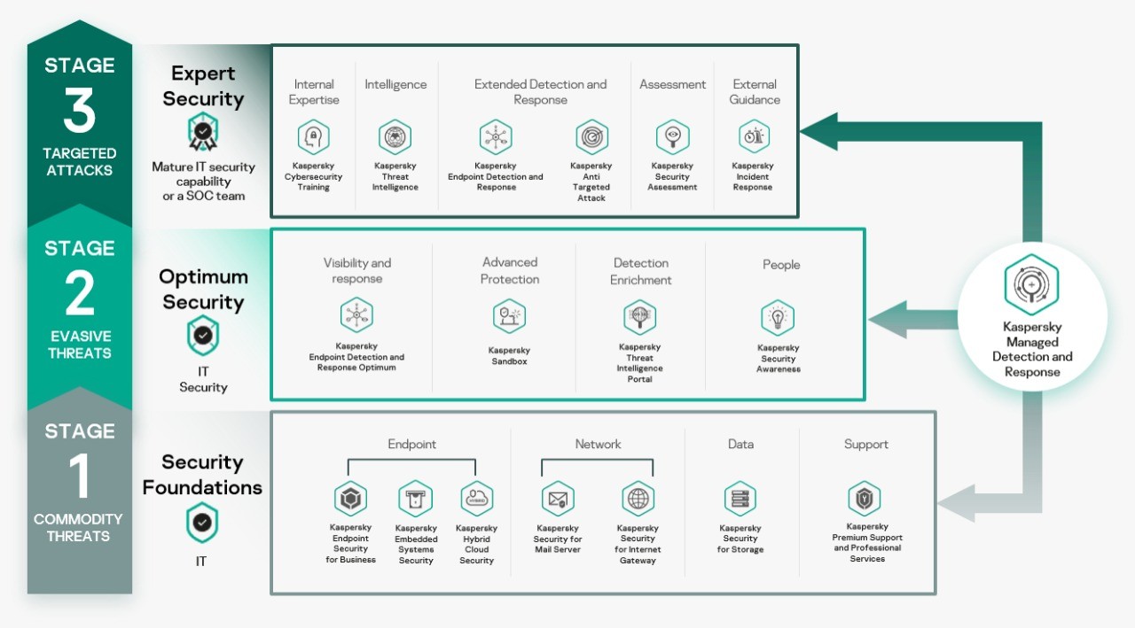 تضمن خدمة Kaspersky Managed Detection and Response (MDR) الجديدة الخاصة بالكشف عن التهديدات الرقمية والاستجابة لها، حماية قائمة على تقنية تعلم الآلات مستمرة على مدار الساعة وطوال أيام الأسبوع، لتمكّن فرق أمن تقنية المعلومات من توفير مواردها لتحليل التهديدات والتحقيق فيها والاستجابة لها. وأصبحت خدمة Kaspersky MDR متاحة الآن للشركات الصغيرة والمتوسطة، بجانب الكبيرة، بفضل المنهجية الجديدة التي بدأت كاسبرسكي في اتباعها، والتي تقوم على تقسيم منتجاتها الأمنية إلى مستويين مختلفين، بناء على مدى درجة النضج والاحتياجات الأمنية التقنية. كذلك حدّثت كاسبرسكي نهجها في مَحافظ منتجاتها باستخدام أطر عمل الأمن الرقمي التي تجمع بين مجموعات مختلفة من الحلول والخدمات الأمنية لتقديم الحماية من مختلف أنواع التهديدات الرقمية.