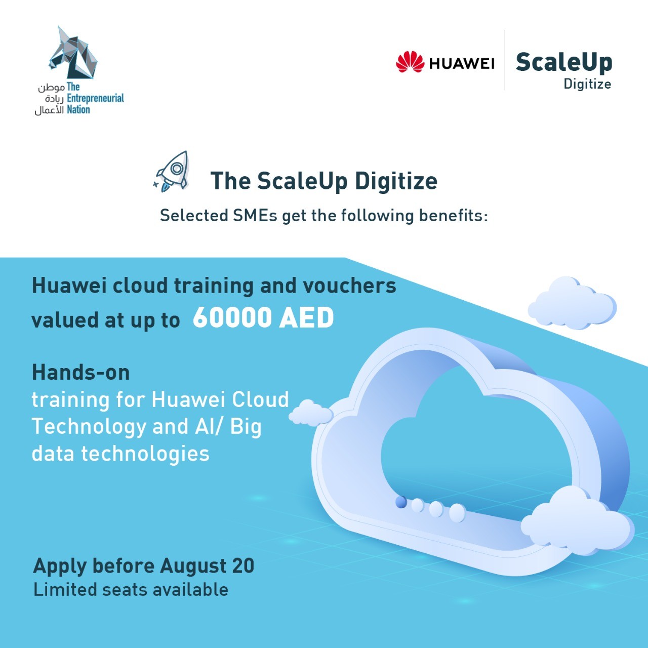 أطلق "موطن ريادة الأعمال"، المشروع الوطني التابع لوزارة الاقتصاد والمصمم لإحداث نقلة في منظومة ريادة الأعمال بالدولة إلى مستوى جديد ومنافس عالمياً، برنامج ScaleUp Digitize بالشراكة مع شركة هواوي العالمية، بهدف تعزيز الابتكار والتحول الرقمي للمشاريع الناشئة والشركات الصغيرة والمتوسطة في دولة الإمارات، وتطوير بنيتها التحتية الرقمية من خلال إتاحة منتجات وخدمات الحوسبة السحابية والتكنولوجيا، بما يساهم في تسريع نموها وتحويلها إلى شركات كبيرة ومليارية قادرة على المنافسة في الأسواق المحلية والعالمية. ويندرج برنامج "ScaleUp Digitize" ضمن مبادرات منصة دعم الشركات السريعة النمو (ScaleUp)التي تعد أحد المسارات الرئيسية الثلاثة لمشروع "موطن ريادة الأعمال".