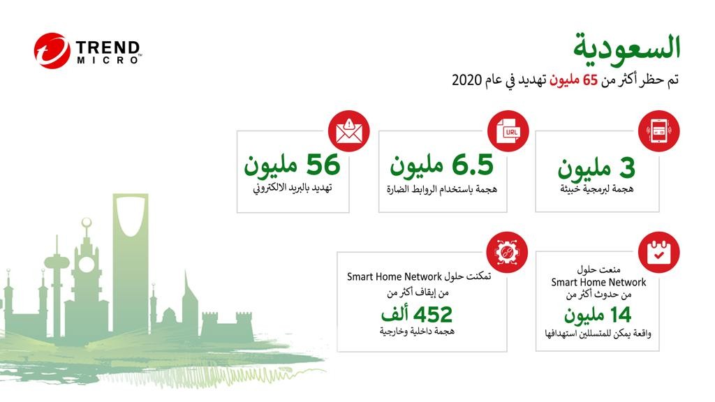 وعلى صعيد المملكة العربية السعودية، أسهمت حلول تريند مايكرو المبتكرة في كشف وإيقاف أكثر من 56 مليون تهديد عبر البريد الإلكتروني، ومنعت حدوث أكثر من 6.5 مليون هجمة Victim باستخدام الروابط الضارة ، فضلاً عن ما يقارب حوالي 17,000 هجمة عبر الروابط المضيفة. كما أسهمت تريند مايكرو في تحديد وإيقاف أكثر من 3 ملايين هجمة عبر البرامج الضارة ، بالإضافة إلى إيقاف ما يقارب 2000 هجمة عبر البرامج الضارة التي استهدفت مواقع بنكية ومصرفية.