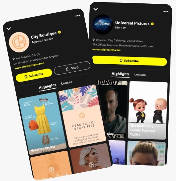 "تتيح الملفات الشخصية العامة للشركات الآن للعلامات التجارية إقامة تواجد دائم على سناب شات لعرض العدسات والأحداث البارزة والقصص الخاصة بك، ويمكن للعلامات التجارية أيضًا تمكين التصفح ، والتجربة والشراء من خلال المتاجر ، وتحويل سناب شات إلى نقطة بيع جديدة."