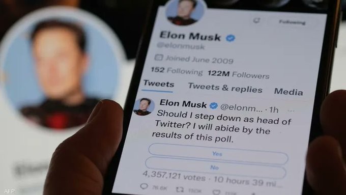 وجاء في الاستطلاع الذي نشره إيلون ماسك: “هل يجب أن أتنحى عن منصبي كرئيس لتويتر؟ سألتزم بنتائج هذه الاستطلاع”، متيحا للناس الاختيار بين الإجابتين “نعم” و”لا”.