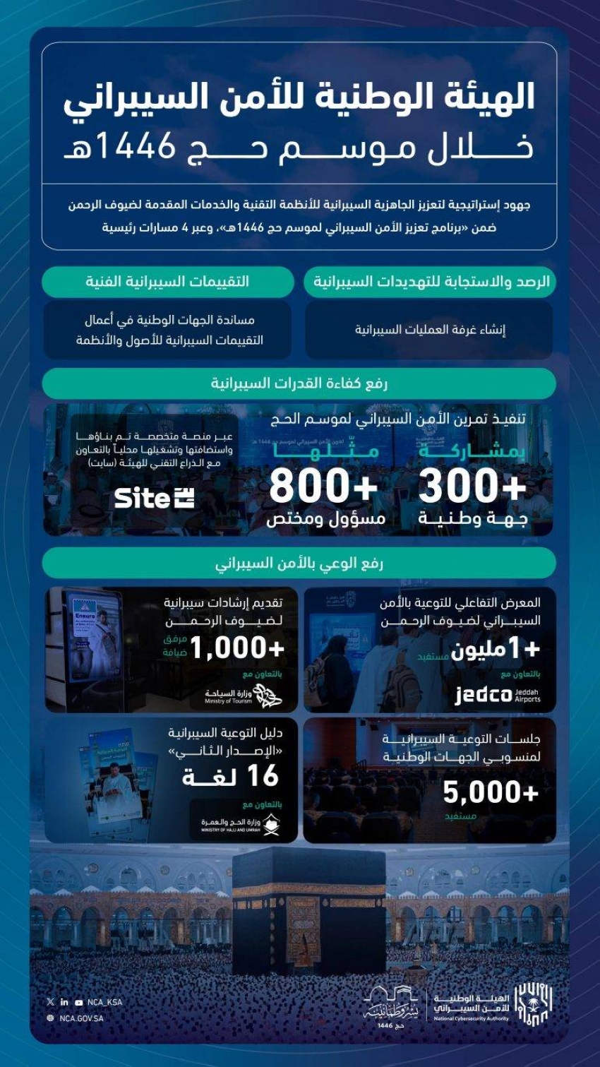 كما تم دعم الجهات في تقييم المخاطر السيبرانية للأصول والأنظمة المتعلقة بموسم الحج لضمان موثوقية وأمان الخدمات.