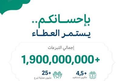 كشفت المنصة الوطنية للعمل الخيري “إحسان”، أن حصيلة التبرعات التي تلقتها بلغت أكثر من مليار و900 مليون ريال، بإجمالي...