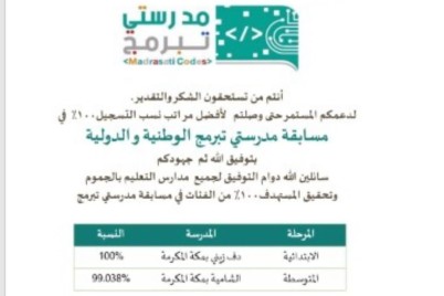 نفذت الإدارة العامة للتعليم بمكة المكرمة متمثلة بمكتب التعليم بالجموم ( بنات )عددا من البرامج لنشر ثقافة مسابقة مدرستي تبرمج...