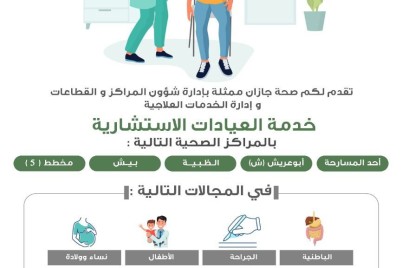 جازان - عـــادل عمـر اطلقت صحة جازان عدد " 30 " عيادة استشارية تعمل على تقديم خدماتها العلاجية للمستفيدين عبر عدد"...