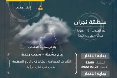 نجران - فهد آل حركان أصدر المركز الوطني للأرصاد اليوم تنبيهاً من تشّكل سحب رعدية مصحوبة بنشاط في الرياح...