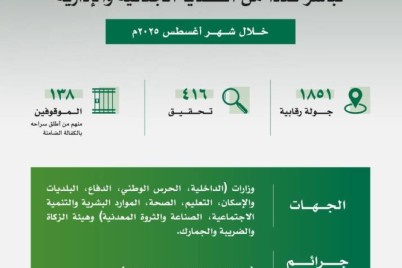 باشرت هيئة الرقابة ومكافحة الفساد "نزاهة" 1851 جولة رقابية خلال شهر أغسطس المنصرم؛ أسفرت عن التحقيق مع 416 مشتبهاً بهم،...