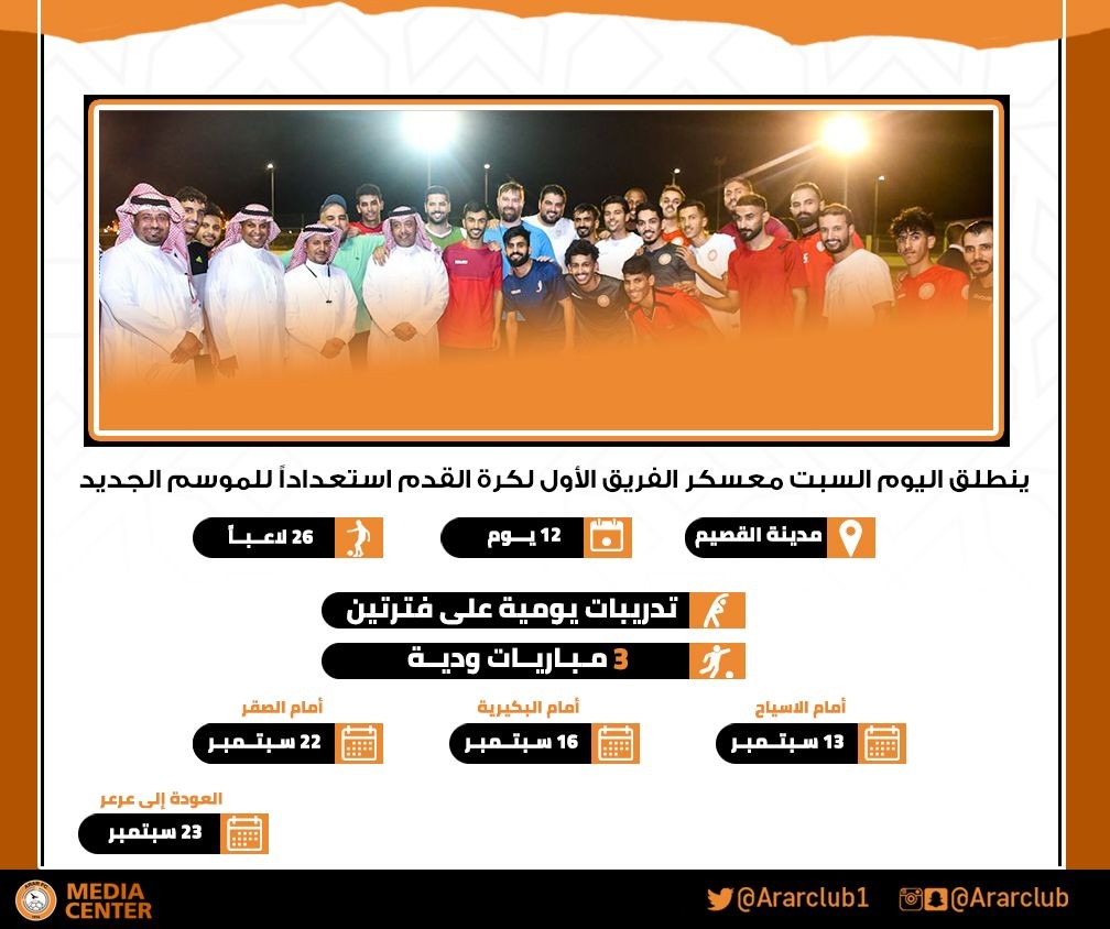 ينطلق مساء اليوم معسكر الفريق الأول لكرة القدم بنادي عرعر استعداداً للموسم الجديد في دوري الدرجة الثانية ، حيث ستحتضن منطقة القصيم معسكر الفريق الذي يضم 26 لاعباً ويمتد لـ 12 يوم .