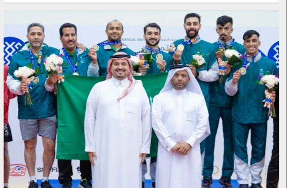 توج نائب رئيس اللجنة الأولمبية والبارالمبية السعودية رئيس البعثة السعودية المشاركة في دورة الألعاب الخليجية الثالثة "الكويت2022" الأمير فهد بن جلوي بن عبدالعزيز بن مساعد، المنتخب السعودي لكرة الطاولة المكون من عبدالعزيز العباد وعلي الخضراوي وعبدالعزيز بوشليبي وتركي المطيري وخالد الشريف، بالميدالية الذهبية لمنافسات الفرق بعد فوزهم في المباراة النهائية على المنتخب القطري 3-0 والتي أقيمت مساء اليوم في ملاعب كرة الطاولة في اللجنة الأولمبية الكويتية.