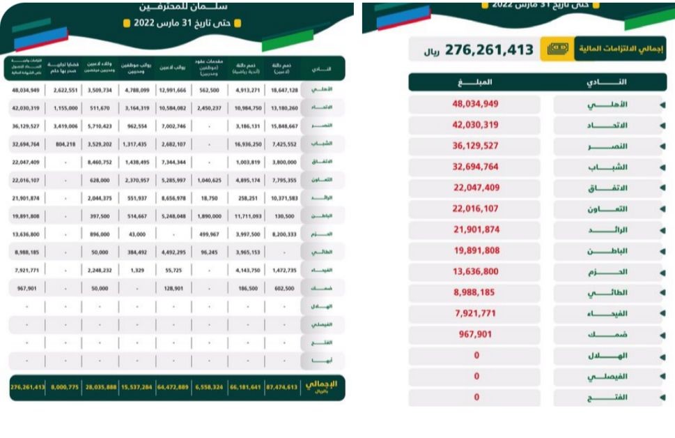 اصدرت لجنة الكفاءة المالية بوزارة الرياضة بيانان عن الالتزامات المالية واجبة السداد حتى 31 مارس 2022 لأندية دوري كأس الأمير محمد بن سلمان للمحترفين، وتحدد يوم 21 أغسطس 2022م كآخر موعد للوفاء بها.