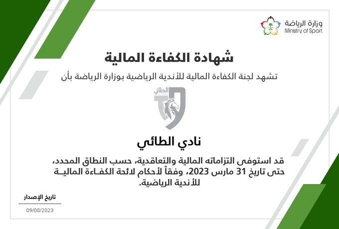 واستوفى الطائي بذلك التزاماته المالية والتعاقدية، حسب النطاق المحدد حتى تاريخ 31 مارس 2023 وفقًا لأحكام لائحة الكفاءة المالية للأندية الرياضية.