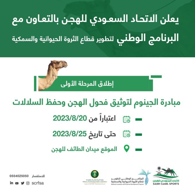 اعلن الاتحاد السعودي للهجن بالتعاون مع البرنامج الوطني للثروة الحيوانية والسمكية عن موعد إنطلاق المرحلة الأولى لمبادرة الجينوم لتوثيق فحول الهجن وحفظ السلالات.