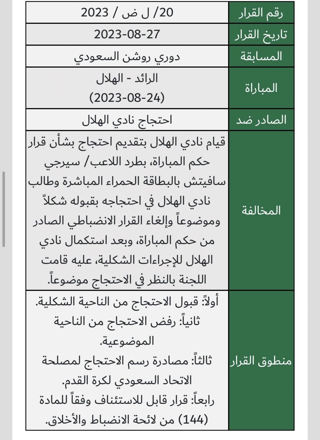 قررت لجنة الانضباط والأخلاق بالاتحاد السعودي لكرة القدم رفض احتجاج نادي الهلال بشأن قرار حكم المباراة بطرد الصربي سافيتش خلال مباراته مع فريق الرائد خلال الأسبوع الماضي.
