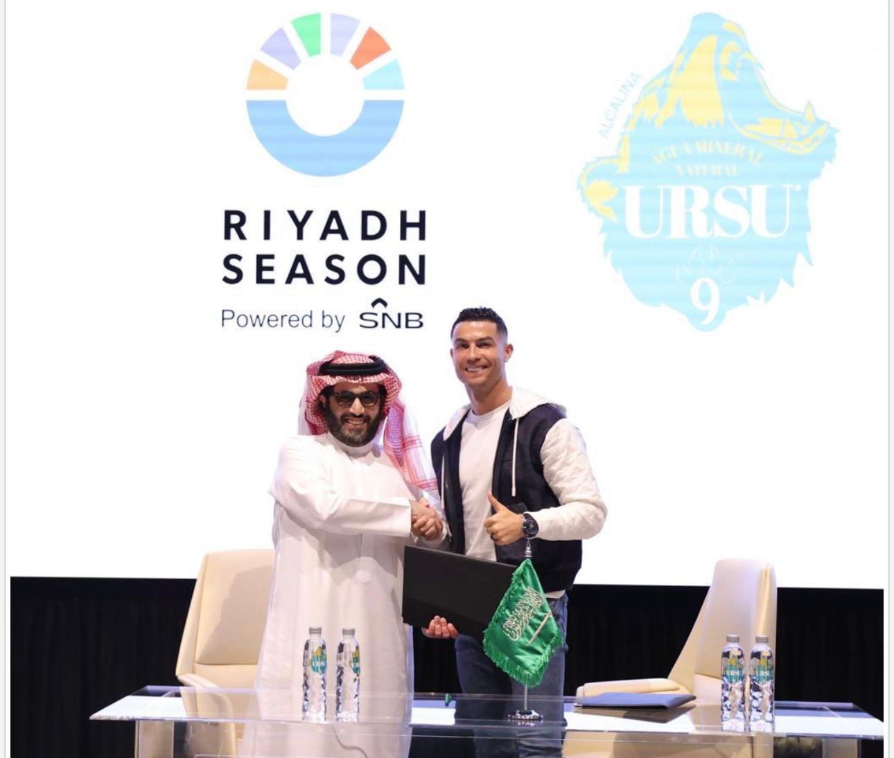 رفع معالي رئيس الهيئة العامة للترفيه المستشار تركي آل الشيخ، الستار عن توقيع نجم فريق النصر والمنتخب البرتغالي كريستيانو رونالدو، مالك شركة “URSU” للمياه، لرعاية الشركة ضمن موسم الرياض 2023.