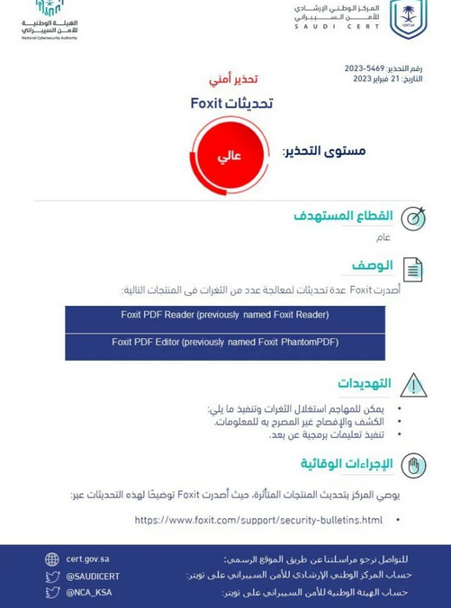 أصدر المركز الوطني الإرشادي للأمن السيبراني، تحذيراً أمنياً عالي الخطورة، بخصوص تحديثات في منتجات Foxit.