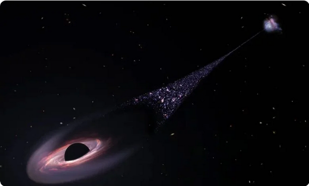 يتدفّق ثقب أسود “ضخم” عبر الفضاء بسرعة قصوى مخلّفاً وراءه سلسلة من النجوم تبعد مئتي ألف سنة ضوئية، على ما أظهر اكتشاف غير مسبوق أفادت به وكالة الفضاء الأمريكية (ناسا).
