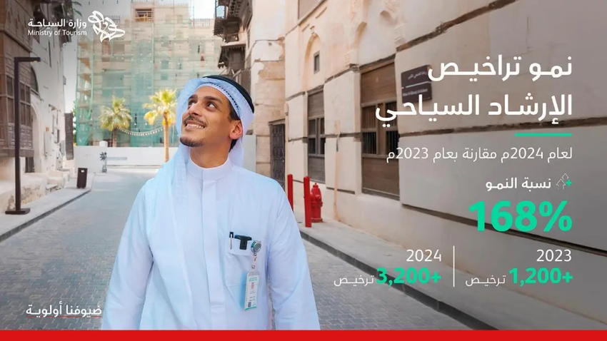 وتضمنت البيانات أعداد تراخيص الإرشاد السياحي، حيث بلغت 3,284 ترخيصًا، بنسبة نمو بلغت 168 % مقارنةً بالعام 2023م البالغ عددها 1221 ترخيصًا.