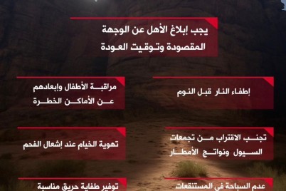 دعت المديرية العامة للدفاع المدني إلى أهمية اتباع إرشادات السلامة أثناء التنزه، واختيار الأماكن الآمنة والمناسبة، والابتعاد عن الأودية والشعاب...