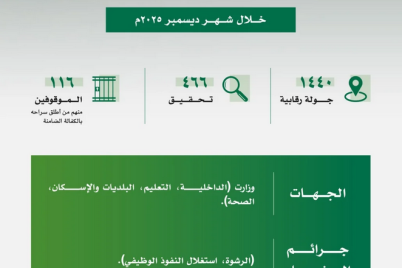 نفذت هيئة الرقابة ومكافحة الفساد "نزاهة" 1440 جولة رقابية، وباشرت عدداً من القضايا الجنائية والإدارية، خلال شهر ديسمبر المنصرم. وأوضحت...
