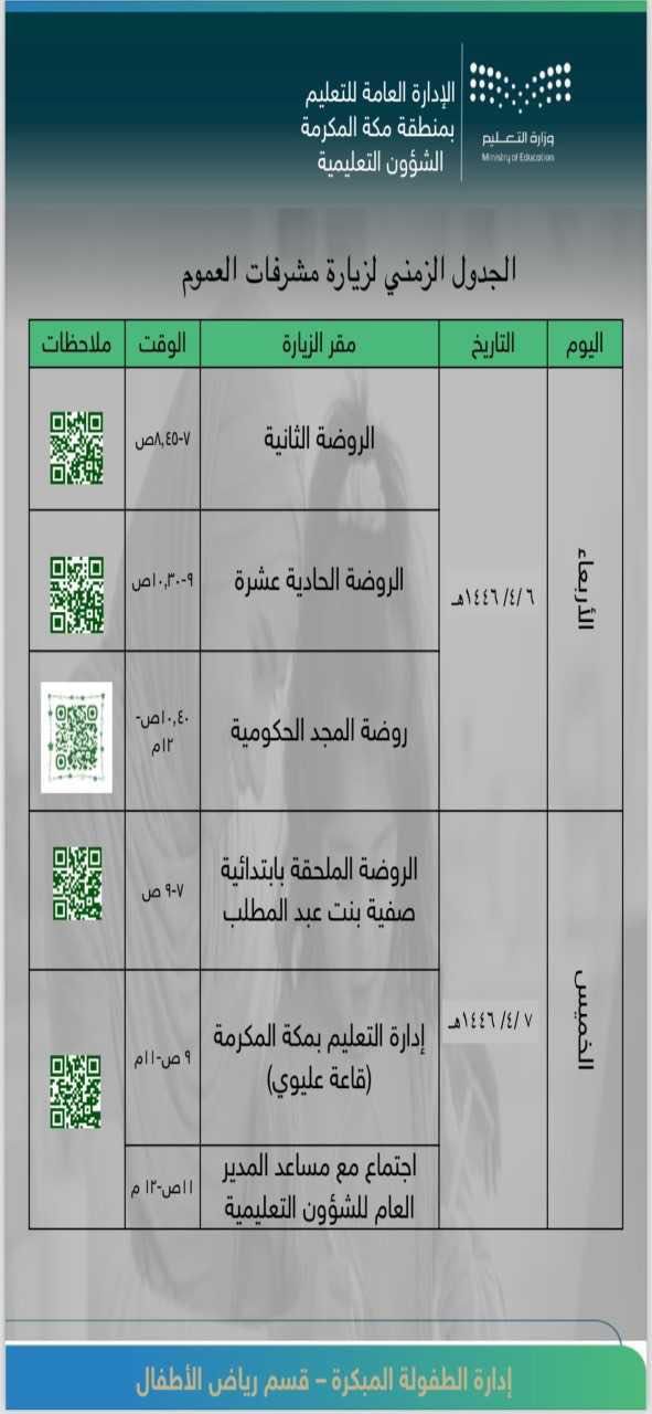 استقبلت الإدارة العامة للتعليم بمنطقة مكة المكرمة ممثلةً بإدارة الطفولة المبكرة مشرفة العموم لرياض الأطفال الأستاذة ساره بنت عبد الكريم المهنا مدير الأداء والدعم بإدارة رياض الأطفال ،و الأستاذة نورة خالد الشويمي مدير مكتب مدير عام رياض الأطفال ، وذلك يومي الأربعاء والخميس الموافق 6 – 7 / 4 / 1446هـ حيث شملت الزيارة كلاً من الروضة الثانية بالعوالي ، والحادية عشر بالشرائع ، المجد بالمعابد ، الروضة الملحقة بابتدائية صفية بنت عبد المطلب بالتنعيم ؛ وذلك بهدف التعرف على التحديات والصعوبات التي تواجه التسجيل في رياض الأطفال ، وتقديم الدعم والمساندة لضمان بيئة تعليمية ملائمة للأطفال ، ومتابعة قوائم الانتظار ، وآليات المعالجة والإجراءات المقترحة بالتعاون مع الجهات ذات الاختصاص ومتابعة الميدان التعليمي .