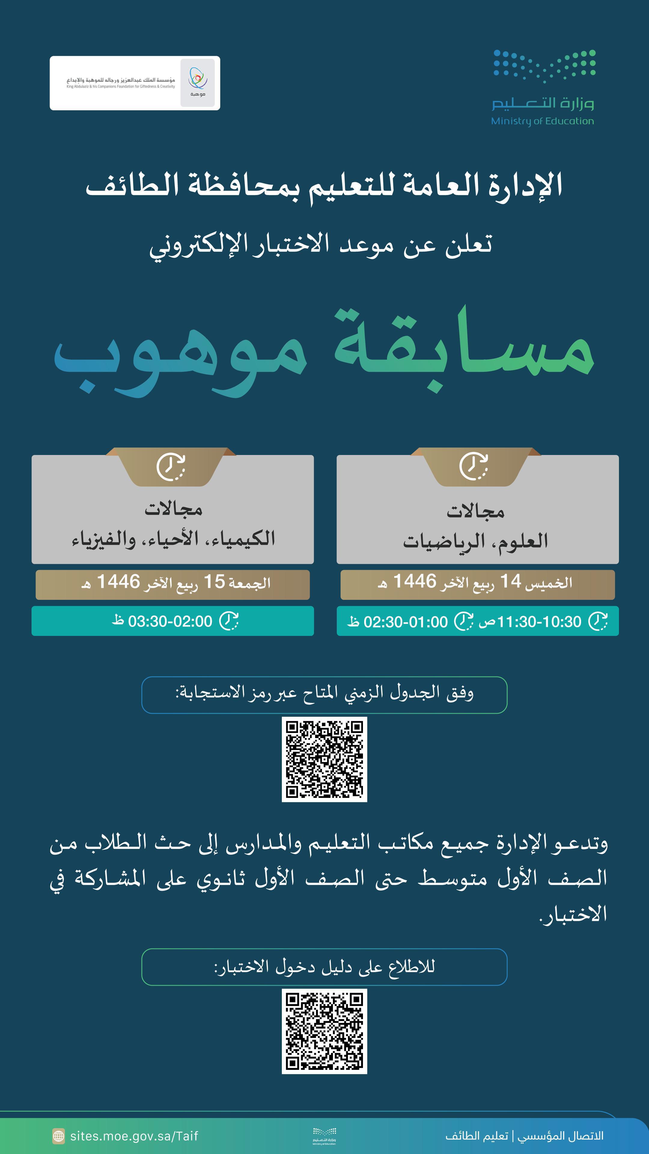 أعلنت الإدارة العامة للتعليم بمحافظة الطائف عن موعد الاختبار الإلكتروني لمسابقة موهوب والذي تشرف عليه مؤسسة الملك عبد العزيز ورجال للموهبة والإبداع ، حيث يبدأ يوم غدٍ الخميس في مجال العلوم والرياضيات وبعد غدٍ الجمعة في مجال الكيمياء والأحياء والفيزياء .