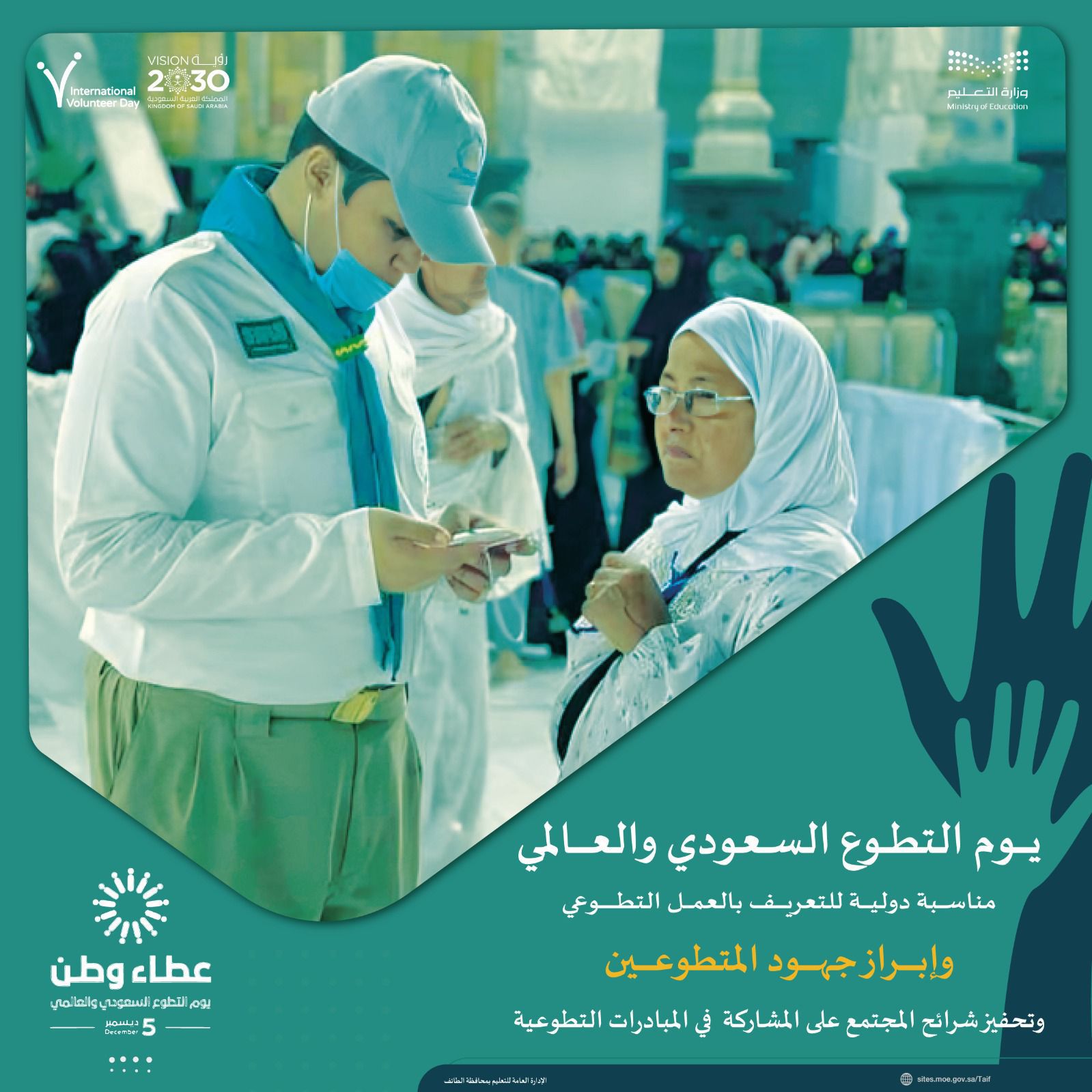 يشارك أكثر من ربع مليون طالب وطالبة في أكثر من 1700 مدرسة في  الإدارة العامة للتعليم في الطائف "بنين ،بنات " في الاحتفاء بيوم التطوع السعودي والعالمي  2024م والذي يوافق الخامس من ديسمبر من كل عام تأكيدًا على منطلقات رؤية المملكة 2030 المتضمنة زيادة عدد المتطوعين إلى مليون متطوع.