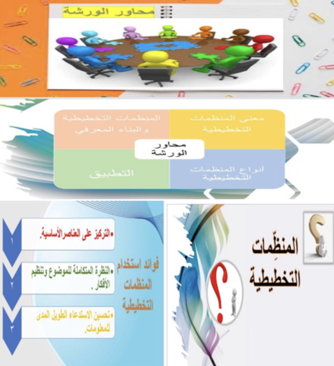 كما تناولت الورشة التعريف بالمنظمات التخطيطية ومفهومها وأنواعها، والبناء المعرفي لدى الطالبات، ثم تلا ذلك عرض أثر المنظمات التخطيطية على التحصيل الدراسي والأثر الإيجابي على تحسين مستوى التحصيل الدراسي لدى المتعلمين.