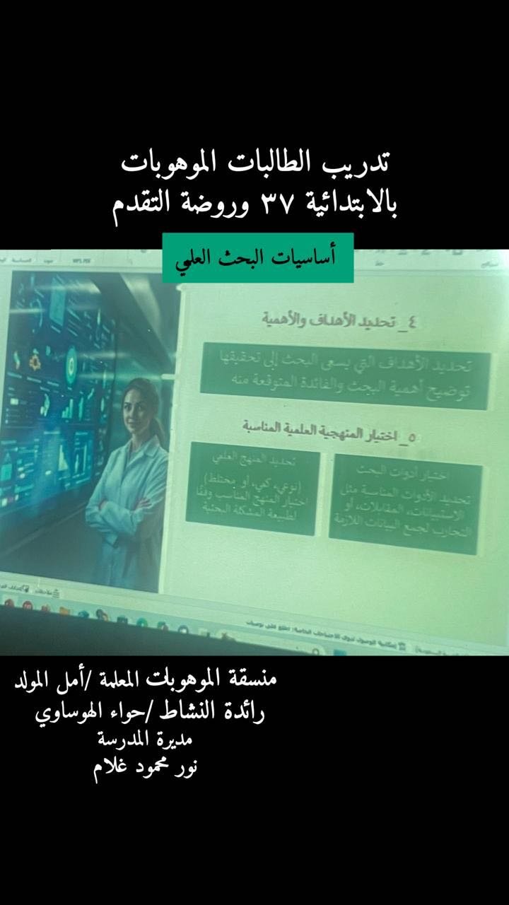 نفذت الابتدائية السابعة والثلاثون وروضة التقدم التابعتان لمكتب تعليم الشوقية بالإدارة العامة للتعليم بمنطقة مكة المكرمة، ورشة تدريبية للطالبات الموهوبات في البحث العلمي يوم الاثنين 1 /6 /1446 هـ، بقاعة الوفاء بالمدرسة ، نفذتها منسقة الموهوبات أمل المولد ورائدة النشاط حواء الهوساوي، فبما قدمت الورشة مها الهوساوي بمتابعةمن قبل قائدة المدرسة نور غلام.