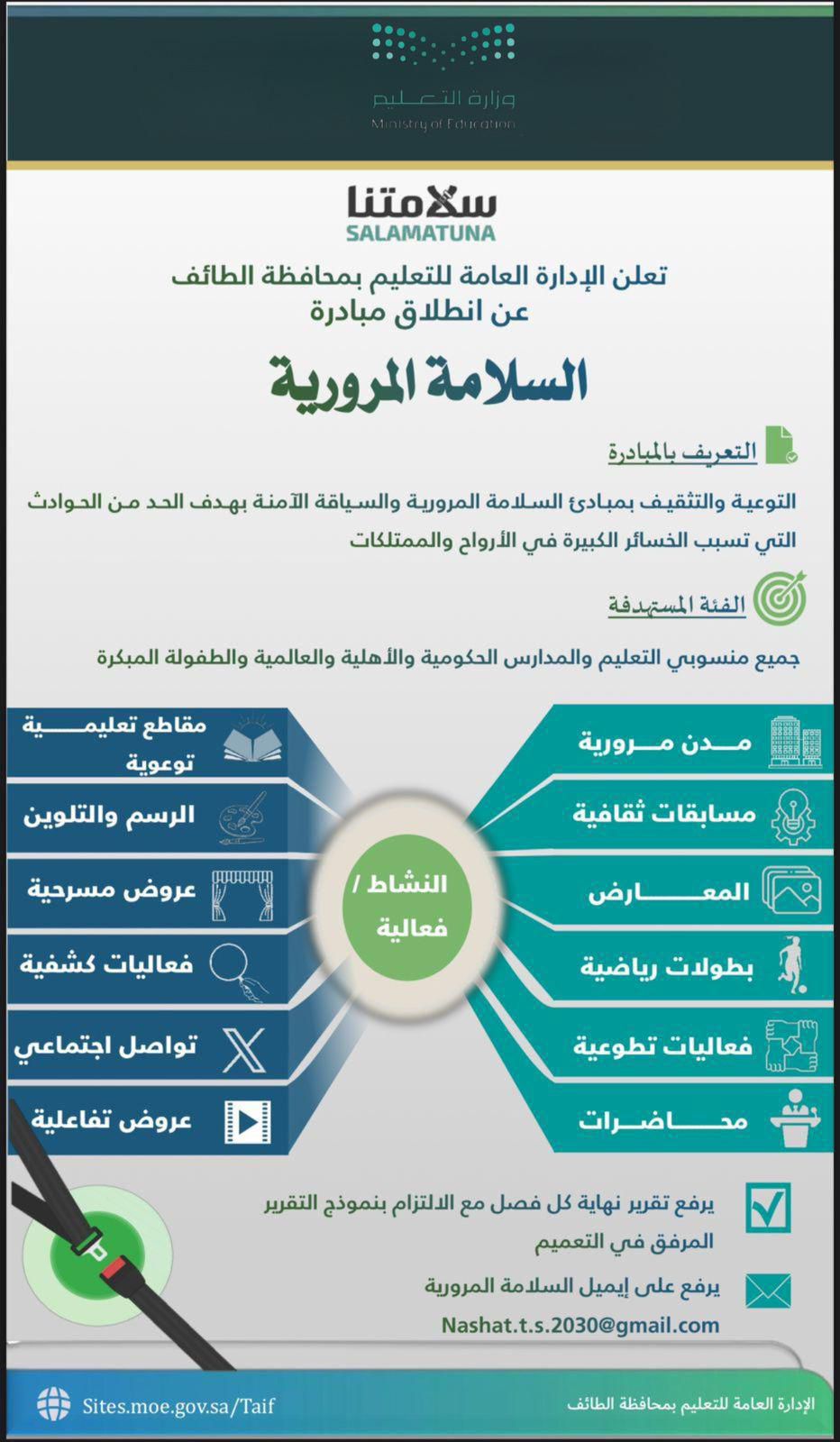 أعلنت الإدارة العامة للتعليم بمحافظة الطائف عن انطلاق مبادرة "السلامة المرورية"، التي تسعى إلى تعزيز الوعي والتثقيف بالسلامة المرورية والقيادة الآمنة، للحد من الحوادث المرورية والخسائر الكبيرة في الأرواح والممتلكات.
