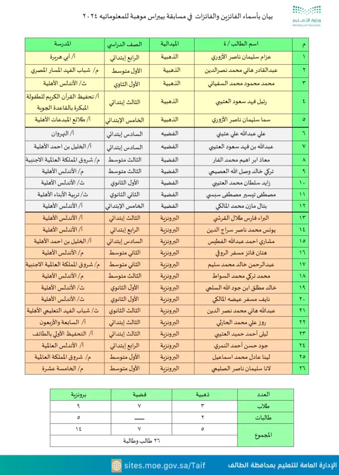 حقق طلاب وطالبات الإدارة العامة للتعليم بالطائف 26 ميدالية في مسابقة بيبراس موهبة للمعلوماتية 2024 م ، 5 ميداليات فضية 7 ميداليات برونزية 14 .