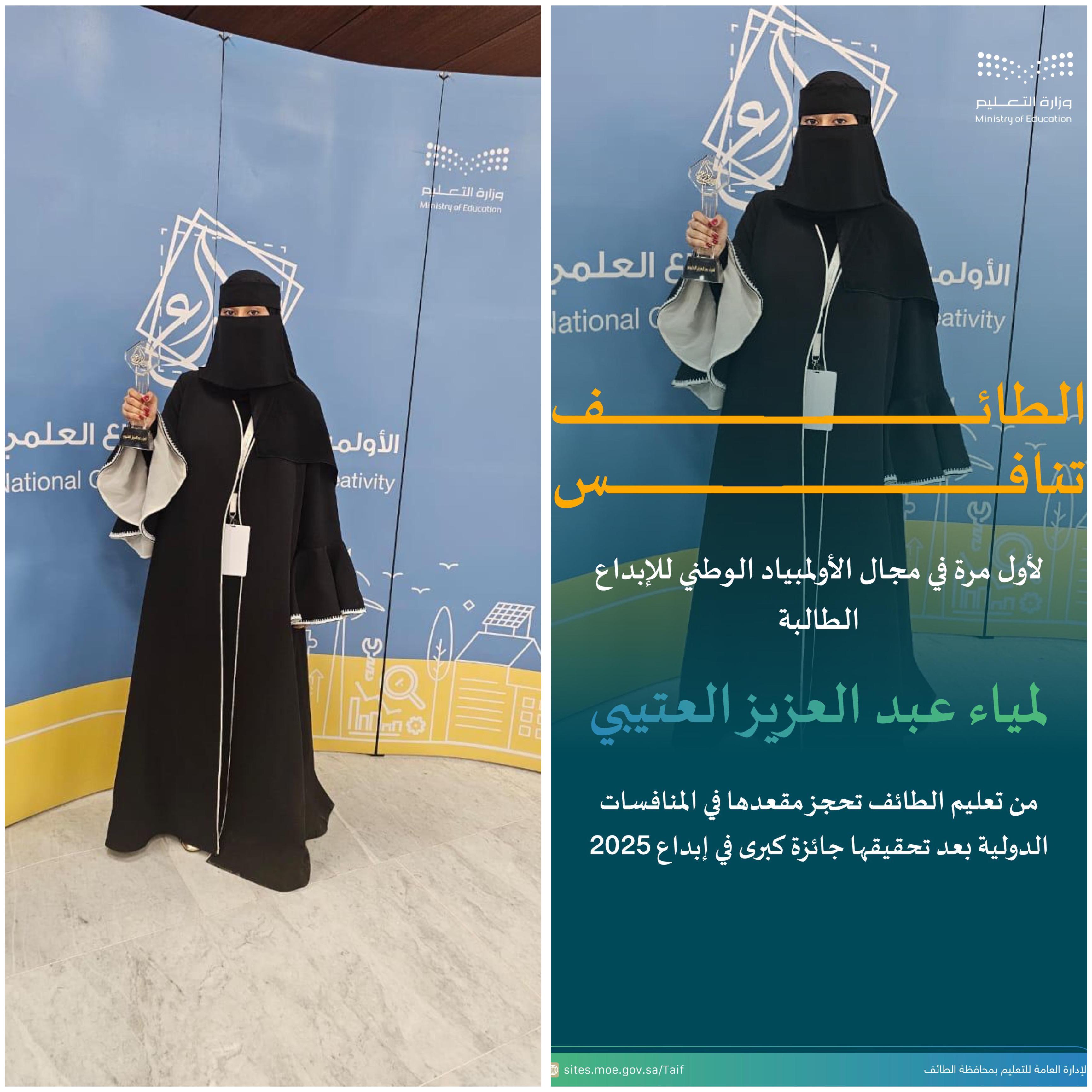 لأول مرة في الإدارة العامة للتعليم في الطائف ، وفي مجال الأولمبياد الوطني للإبداع حجزت الطالبة لمياء عبد العزيز العتيبي مقعدها في المنافسات الدولية بعد تحقيقها جائزة كبرى في إبداع 2025.