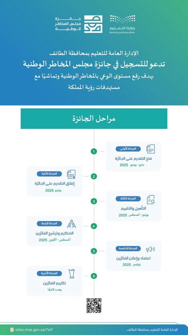تعليم الطائف يدعو للتسجيل في جائزة مجلس المخاطر الوطنية