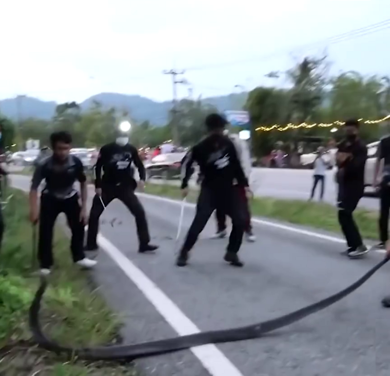 أثارت حية ملك كوبرا عملاقة، الذعر الشديد في تايلاند، حين واجهت فريقًا من 12 صياد ثعابين في معركة ضارية على أحد الطرق السريعة، كان فيها الجميع يخشى لدغتها القاتلة.