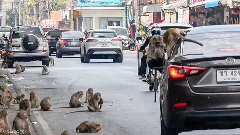 اجتاحت قطعان من القردة البرية بلدة تايلاندية قرب العاصمة بانكوك، إلى درجة أنها صارت تقفز فوق السيارات والبشر، بحثا عن الطعام، الذي تتقاتل للحصول عليه.