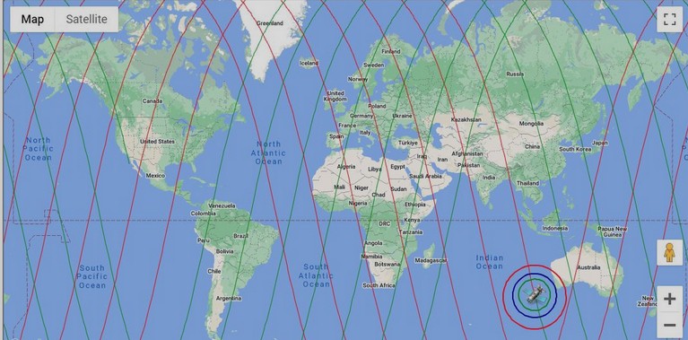 وتبين الخارطة المرفقة موقع السقوط المتوقع حاليا وتبين الخطوط الخضراء والحمراء الأماكن التي سيمر فوقها القمر الصناعي خلال عشر ساعات قبل وبعد موعد السقوط المتوقع.