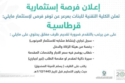 الحدود الشمالية/ باسمه الضويمر أعلنت الكلية التقنية للبنات بعرعر عن توفر فرص للإستثمار مايلي:1- قرطاسيةعلى من يرغب بالتقدم ضرورة...