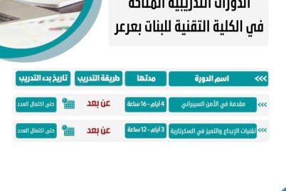 الحدود الشمالية ـ باسمه الضويمر يعلن مركز خدمة المجتمع والتدريب المستمر في كلية التقنية للبنات بعرعر عن بدء التسجيل في...