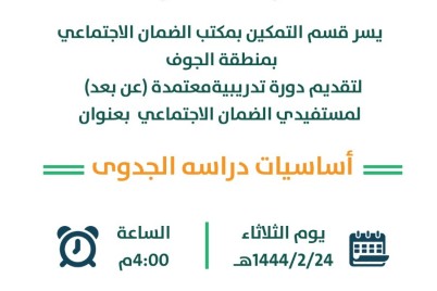 الجوف - سعد حمد الشمري نظم مكتب الضمان الاجتماعي المكتب الرئيسي بمنطقة الجوف ممثلا بقسم التمكين الثلاثاء الموافق ١٤٤٤/٢/٢٤هـ دورة...