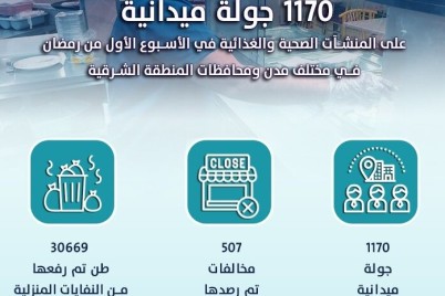 نفذت أمانة المنطقة الشرقية خلال الأسبوع الأول من شهر رمضان المبارك ، 1170 جولة ميدانية، في مختلف المدن والمحافظات...