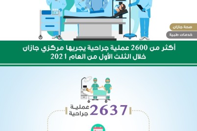 جازان - عفاف مدخلي قالت صحة جازان بأن أقسام الجراحة بمستشفى الملك فهد المركزي بجازان قامت بإجراء 2637 عملية...